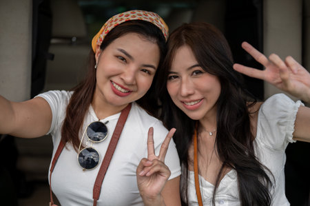 Two pretty and happy young Asian women are enjoying their road trip to the countryside, taking selfies together in a car's open trunk. Happy moment, road trip, vacation, holiday