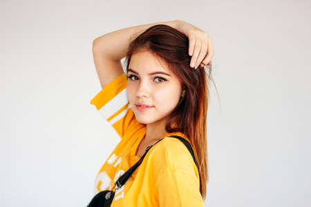 Portrait of carefree smiling teenager girl with dark long hair in yellow t-shirt on the grey background