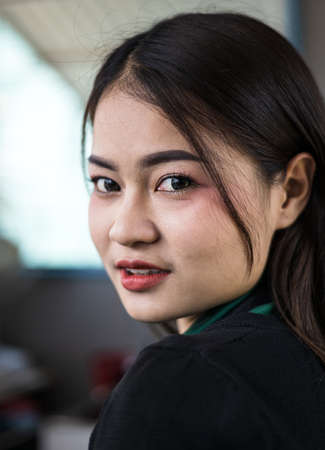 A close-up of a portrait of a beautiful Thai woman smiling seductively inside her coffee shop, giving the onlookers charming eyes and lips.
