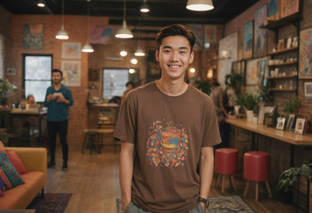 A casual young man stands confidently in a vibrant cafe. He wears a brown t-shirt with a unique graphic print.