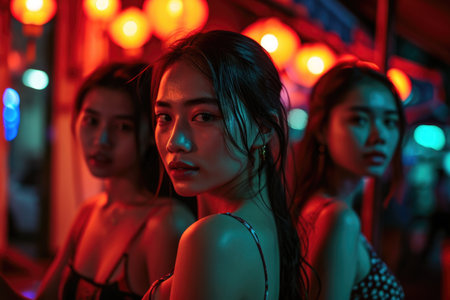 An up-close photo capturing the captivating beauty of Thai women as they lock eyes with the camera amidst the nocturnal cityscape