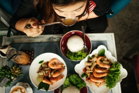 top view young asia woman eating in restaurant with seafood fried shrimp and rice on wood table background