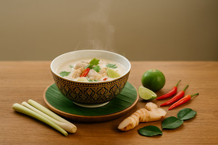 AI generated authentic Thai tom kha gai coconut chicken soup served in ornate Thai ceramic bowl and fresh galangal, lemongrass and kaffir lime leaves used in preparation, steaming hot