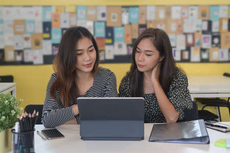 Two women business colleagues working with computer tablet together.