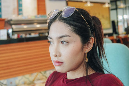 Calm young Asian woman wearing sunglasses and maroon shirt sitting in a chair, looking to the front, cafe background.