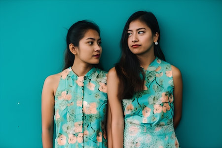 Two beautiful Asian women in a blue and green dress on a green background