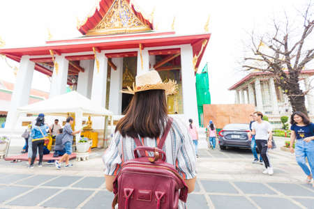 Asian backpacker women wear sun hat traverl in temple of buddha in Bangkok Thailand