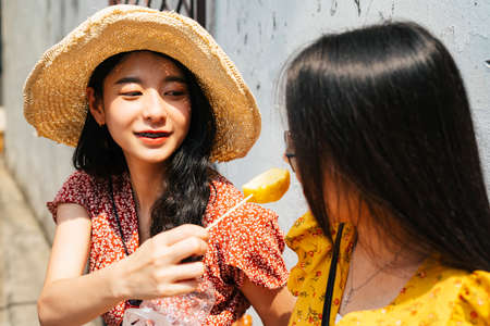 Two happy Asian women are taking photograph together. Concept of friendship.