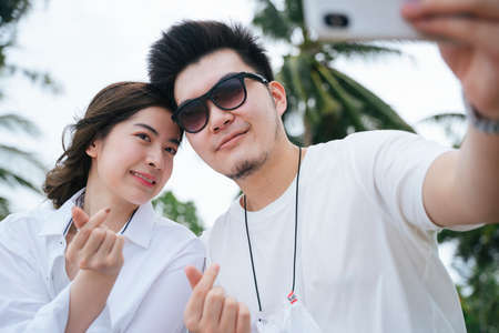 Asian couple traveler taking selfie with smartphone on tropical island.