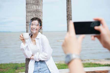 Man taking photo with smartphone at beautiful asian woman wearing face shield holding coffe mug lean on coconut tree on the beach.