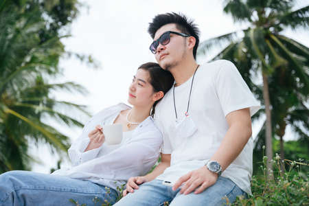 Romantic asian couple traveler sitting together on the beach.