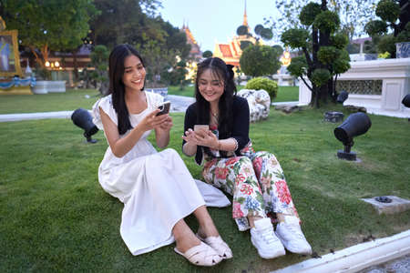 Two friends sitting on the garden of a buddhist temple using the mobile