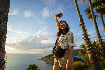Travelers at Phromthep cape viewpoint at the south of Phuket Island, Thailand. Tropical paradise in Thailand. Phuket is a popular destination famous for tourists