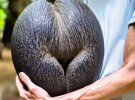 Female coconut Coco de mer souvenir landmark of Seychelles closeup view