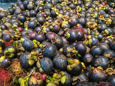 Pile of mangosteen on a black tray,shot in supermarket