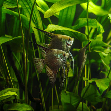 A green beautiful planted tropical freshwater aquarium with fishes, zebra angelfish pterophyllum scalare aquarium