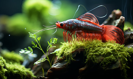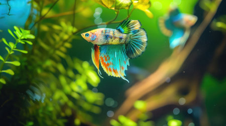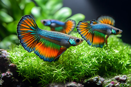 Colorful guppy fish swim gracefully among lush greenery in an aquarium, showcasing their vibrant tails and intricate patterns. this lively aquatic scene is perfect for nature enthusiasts and pet lovers seeking vivid underwater imagery. Generative AI