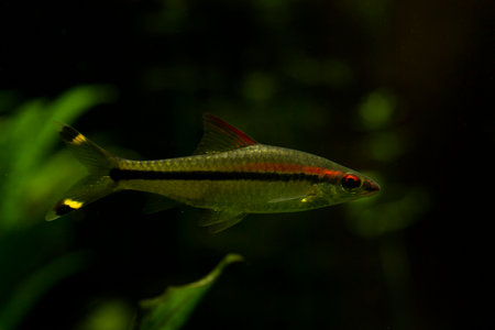 Denison barb Sahyadria denisonii swimming on a fish tank with blurred background. Flock of Denison barb fishes Puntius denisonii in freshwater aquarium