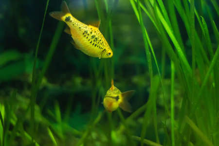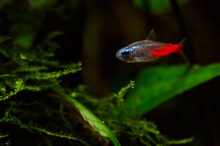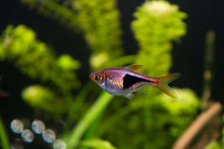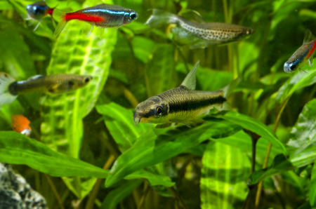 Colorful tetra fish in hobby auqarium with green water plants