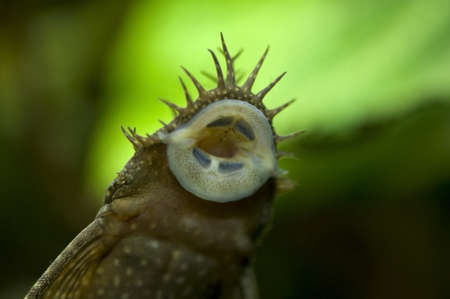 Ancistrus aquarium fish among algae, mouth sucked to the glass