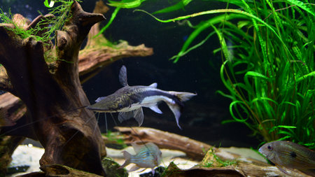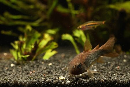 Freshwater catfish in home aquarium. Corydoras paleatus.