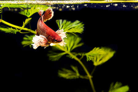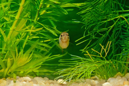Single Fathead minnow (Pimephales promelas), which is commonly known as the rosy-red minnow, swimming in a densely planted tropical fish tank