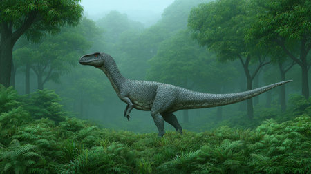 This captivating image depicts a lifelike dinosaur in a serene prehistoric forest, surrounded by lush ferns and enveloped in soft mist, creating an ethereal ambiance.