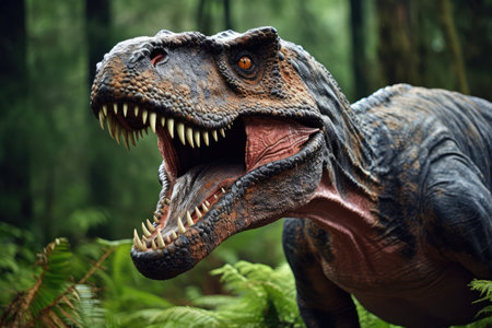 Big scary Dinosaur roaring in jungles, prehistoric plains. Ancient reptile with sharp teeth. Dark green blurred backdrop.