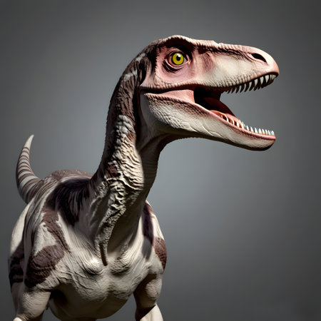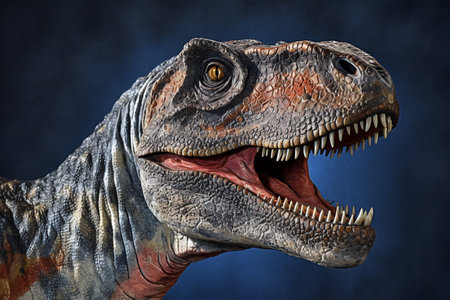 A detailed close-up view of a dinosaur with its mouth wide open. This image can be used to depict prehistoric creatures, dinosaur exhibitions, educational materials, or for adding an element of adventure to creative projects.