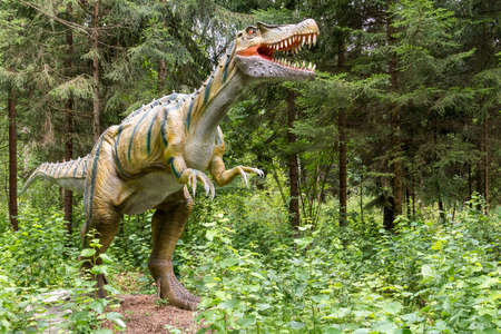 Statue of realistic prehistoric dinosaur in a wild forest