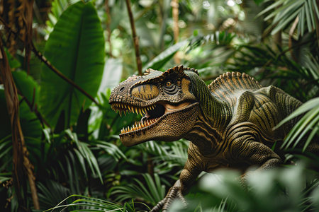 This captivating image features a lifelike green dinosaur standing amidst lush jungle vegetation, showcasing intricate scales and immersive details.