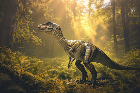 A dinosaur moves gracefully through a dense jungle filled with vibrant ferns and towering trees, illuminated by warm golden hour light. The lush environment evokes a sense of ancient life and natural beauty in a prehistoric setting.