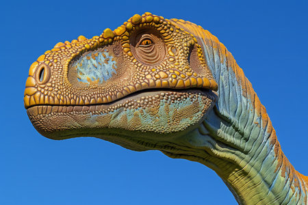 Tyrannosaurus Rex Dinosaur Head close-up against blue sky