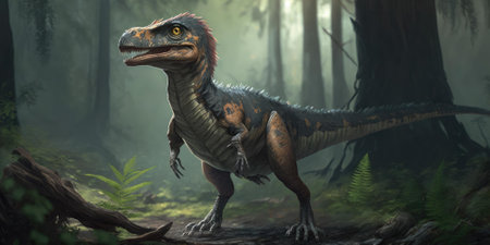 Velociraptor dinosaur in the forest at night.