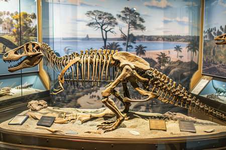 Prehistoric Dinosaur Skeleton on Display in Natural History Museum Exhibit with Educational Background AI Generative