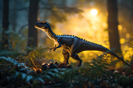 Tyrannosaurus rex dinosaur toy in the forest at sunset