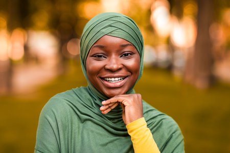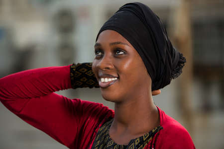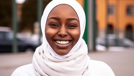 Portrait of beautiful African Muslim woman in hijab smiling at camera outside.