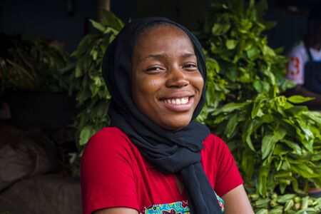 Arusha, Tanzania - December 20, 2019: African woman on the street near home of Zanzibar island, Tanzania, East Africa, close up