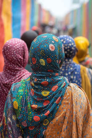 A group of women, wearing a variety of colorful headscarves and traditional attire, strolls through a lively market filled with vibrant textiles. The atmosphere is festive and represents cultural richness.