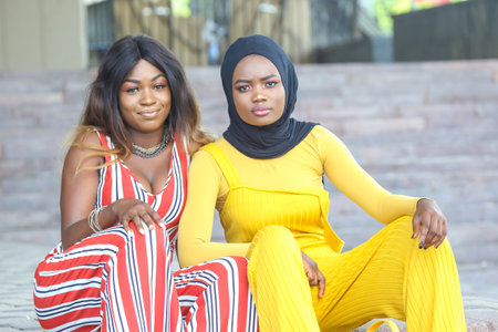 Two African women sit together outdoors, dressed in vibrant outfits. One wears a yellow ensemble combined with a black hijab, while the other showcases a red-stripped dress.