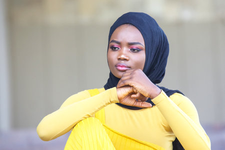 An African woman with a black hijab is seated thoughtfully, wearing a bright yellow top.