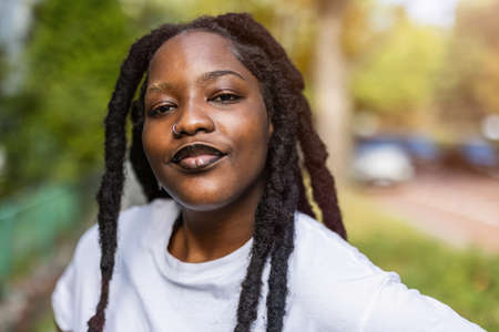 Close up portrait of gorgeous woman with African braids wearing walks down the street.