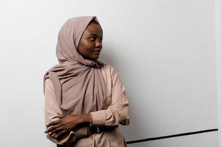 Muslim black girl on white background. African business woman in studio. Model posing. Advert for banking and islamic social media
