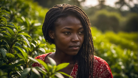 An African woman wearing a yellow top and black hijab appears thoughtful. The background features natural elements, creating a serene atmosphere.