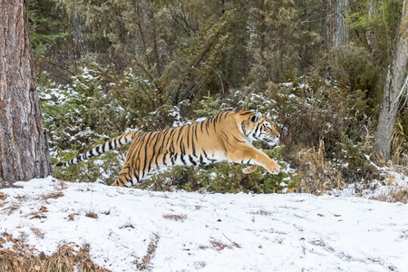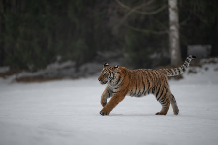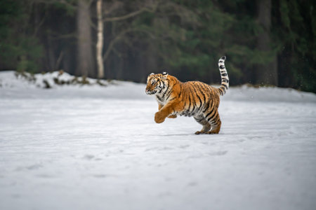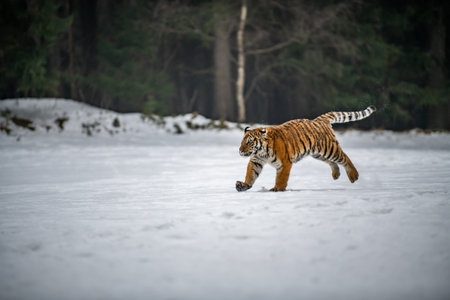 Siberian Tiger running in snow. Beautiful, dynamic and powerful photo of this majestic animal. Set in environment typical for this amazing animal. Birches and meadows