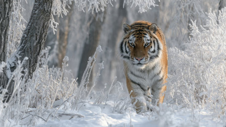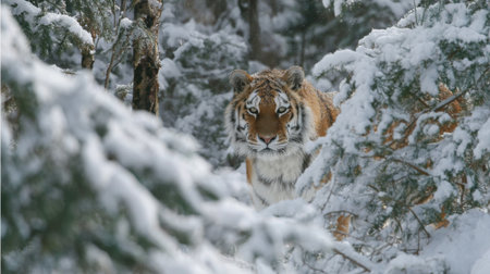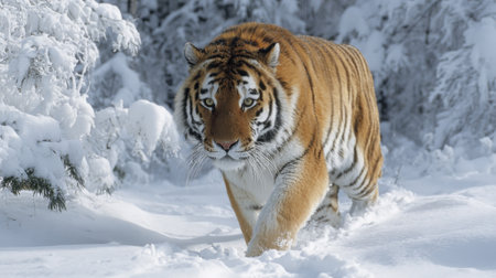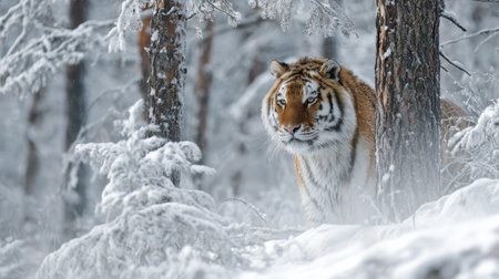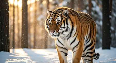 A Bengal tiger pads silently through a snowy forest, striped golden coat stark against white drifts, keen eyes scanning for prey as it stalks with patience, power, and winter-honed grace.