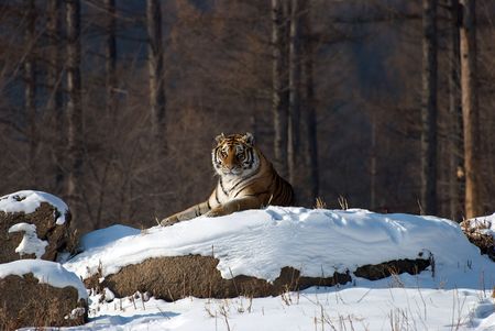 Siberian tiger, Panthera tigris altaica in a taiga filled with snow, Animal relax on snow