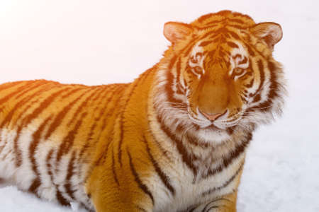 Close up portrait of one young Amur (Siberian) tiger in fresh white snow sunny winter day, looking at camera, low angle view