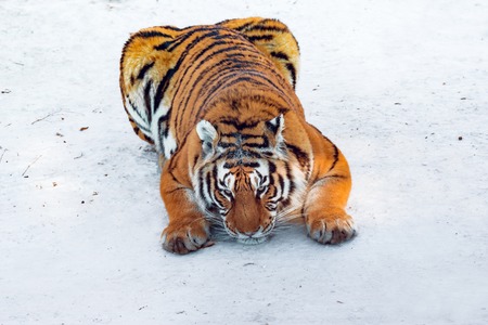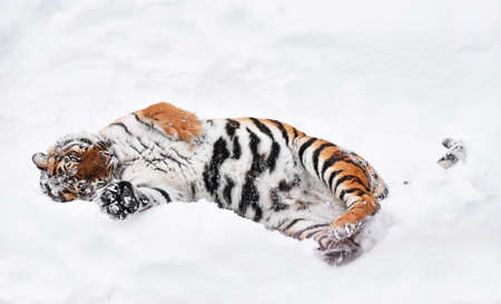 One young female Amur (Siberian) tiger playing and rolling in fresh white snow sunny winter day and looking at camera, full length high angle view