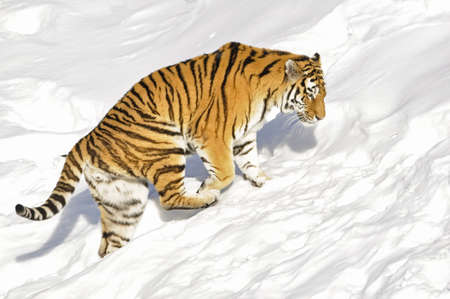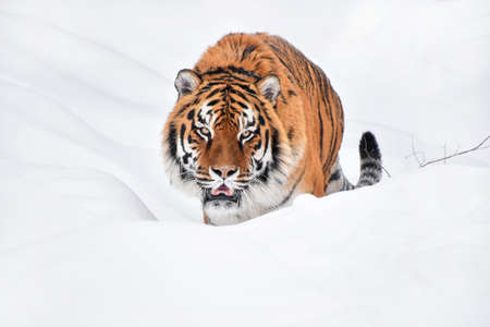Amur Tiger on white snow during cold winter